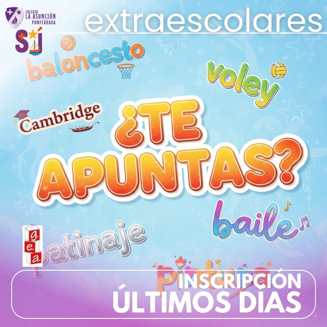 El plazo de matriculación a las actividades extraescolares se amplía al viernes 26 de septiembre. También se ofrece un horario alternativo del nivel starters 2 de Cambridge a aquellas personas que tengan incompatibilidad por baloncesto: martes y jueves de 16:45 a 17:45. Para realizar dicha inscripción se debe comunicar al coordinador de extraescolares: Esta dirección de correo electrónico está siendo protegida contra los robots de spam. Necesita tener JavaScript habilitado para poder verlo.