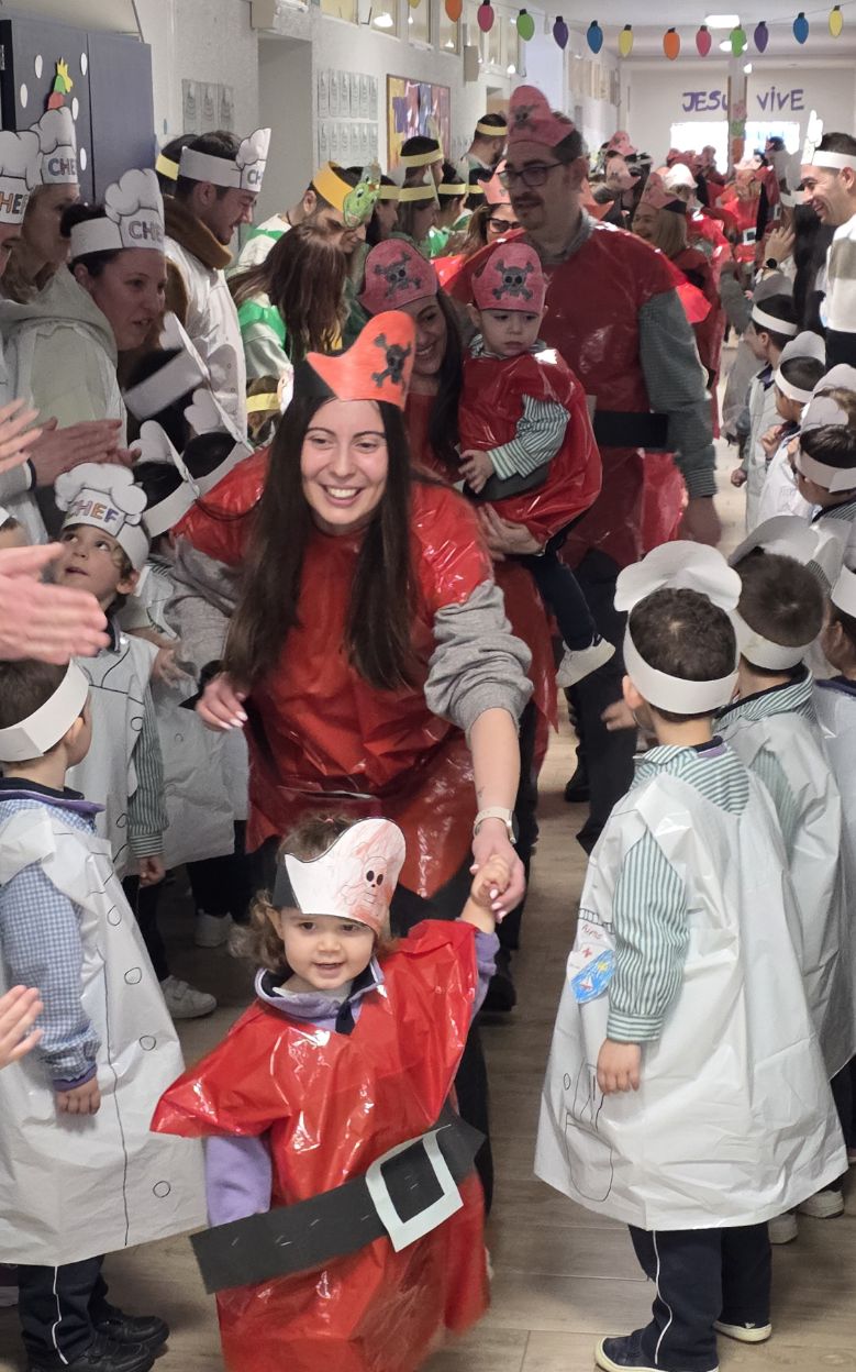 En esta ocasión debido al mal tiempo, no pudimos hacer el desfile en el exterior, pero nada pudo ante las ganas e ilusión de desfilar de los peques del cole y sus familias al son de la música más apropiada para tal ocasión. Disfraces que durante varios días prepararon con esfuerzo y mucho cariño en los talleres de Carnaval - ver aquí -
