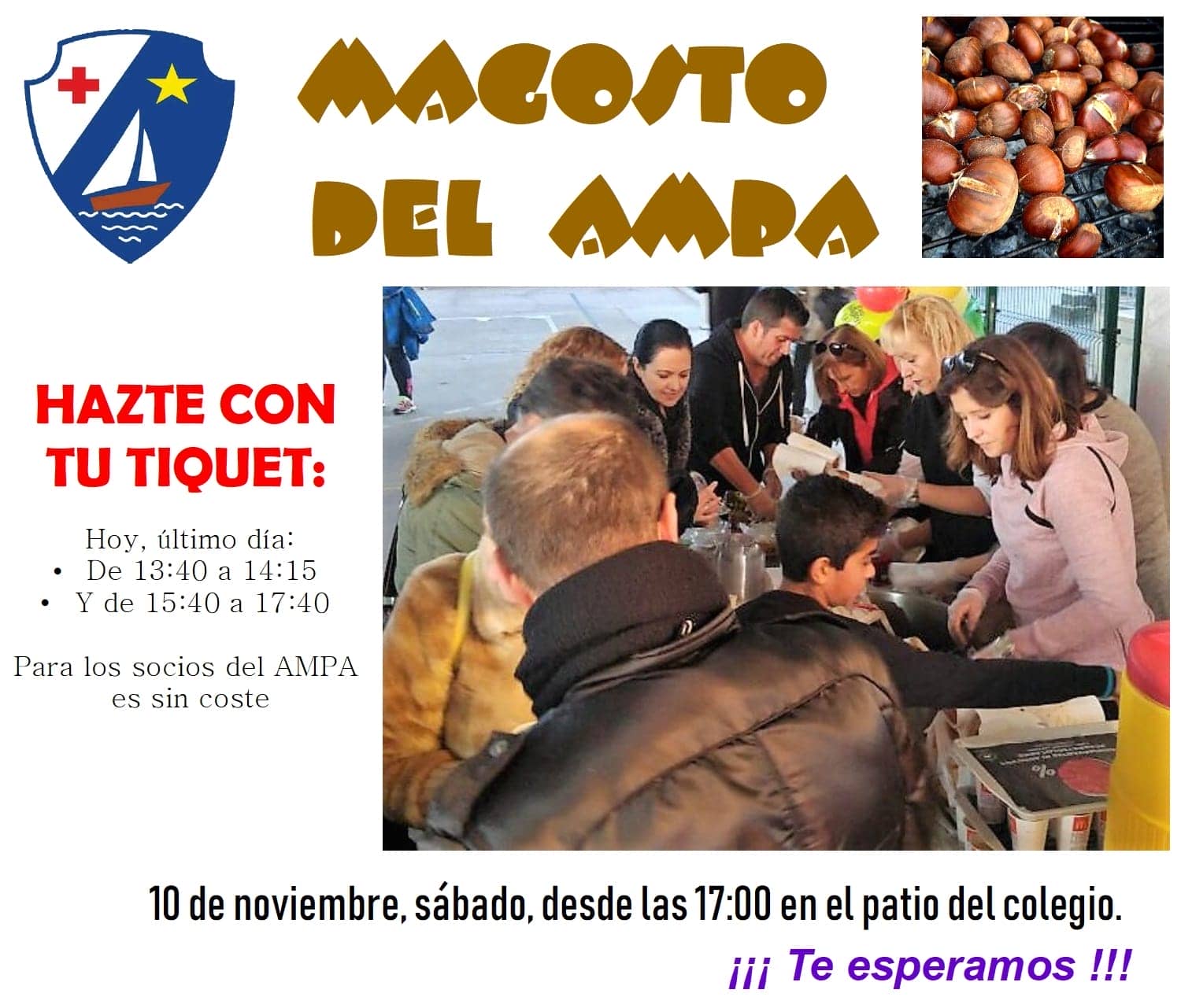 El sábado día 10 de noviembre, a partir de las cinco de la tarde, se celebrará en el patio del colegio el tradicional Magosto organizado por el AMPA.