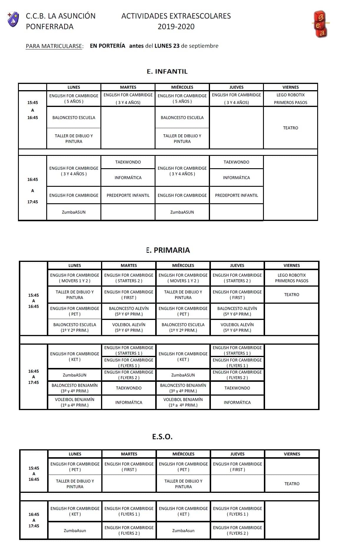 OFERTA DE ACTIVIDADES: English for Cambridge (somos centro examinador en Ponferrada), Taller de dibujo y pintura, Baloncesto, Informática, Voleibol, Predeporte, Robótica con Lego, ZumbaAsunción, Teatro... Cada actividad estará sujeta a que se produzca un número suficiente de matriculados.