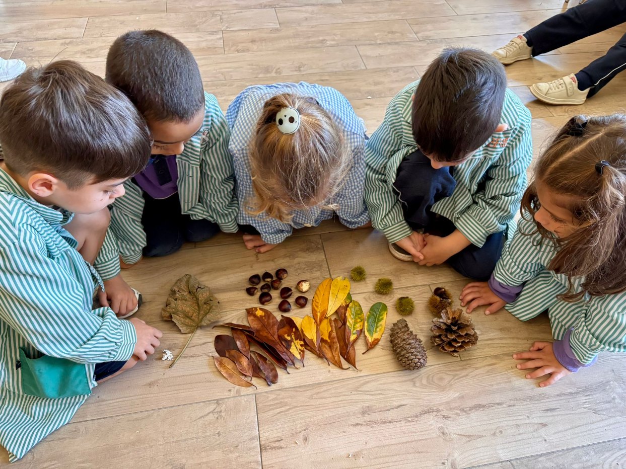 Hemos observado todos los cambios que se producen en la naturaleza y hemos recogido hojas secas, piñas, erizos, castañas… un montón de tesoros de otoño que luego hemos observado todos juntos en clase.