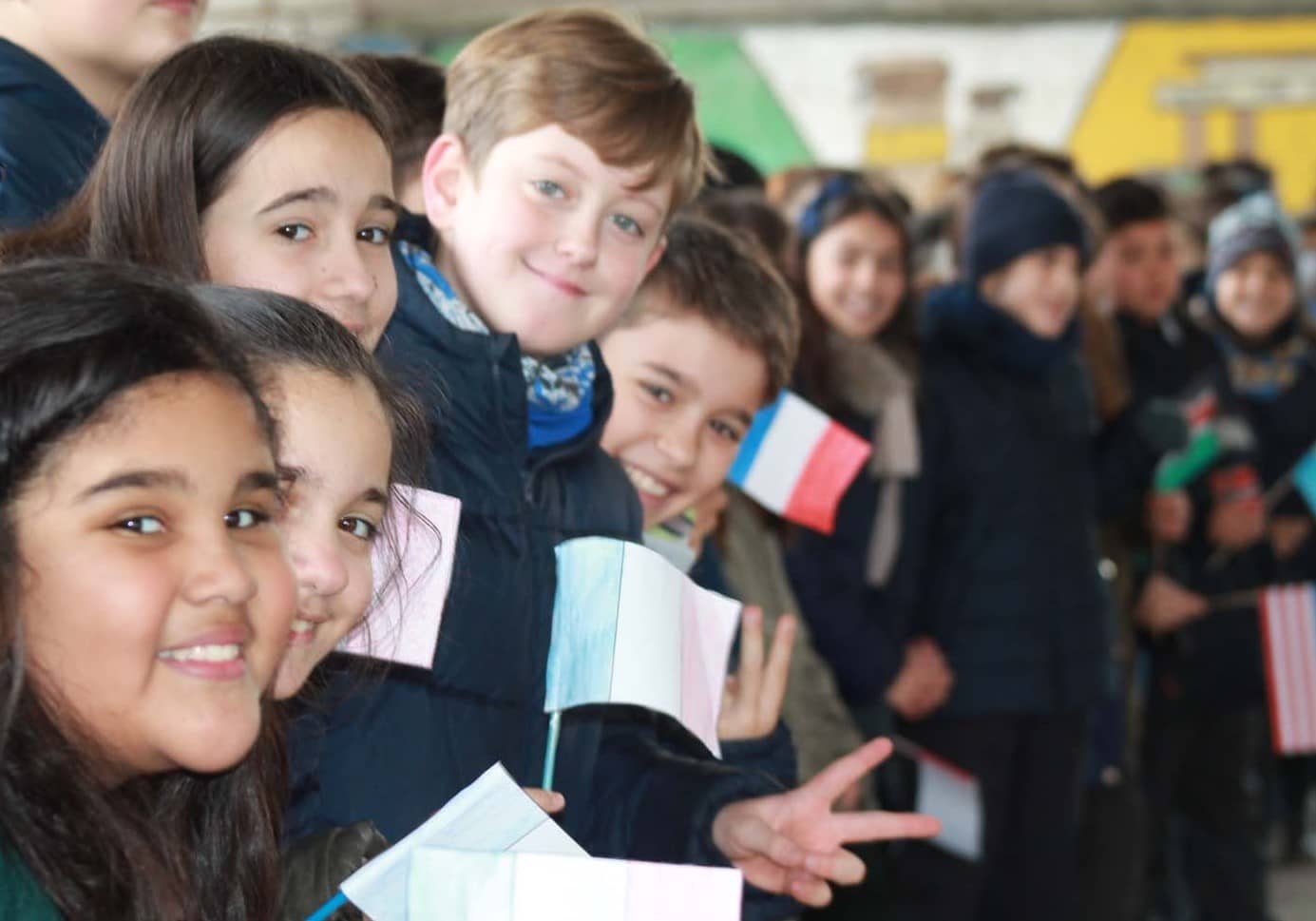 A continuación, nuestros alumnos de 4º de la ESO leyeron el manifiesto en favor de la convivencia pacífica, dando pie a la interpretación musical del tema “Green Lands” de Carlos Núñez, a cargo de una pequeña orquesta formada por alumnos de Primaria y Secundaria; simultáneamente, un grupo de alumnos de Primaria escenificaba el movimiento de las banderas de diferentes países alrededor de un paracaídas multicolor que simbolizaba el planeta Tierra.