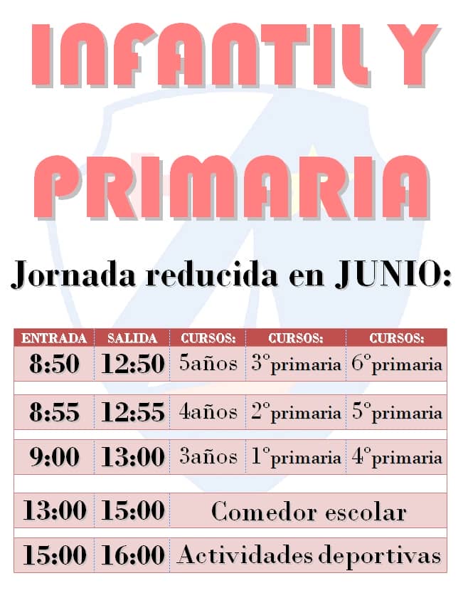 El martes 1 de junio comenzaremos el horario de jornada reducida establecido por la Junta de Castilla y León y que durará hasta el miércoles 23 de junio, fecha en la que finalizarán las clases (este día habrá comedor escolar).