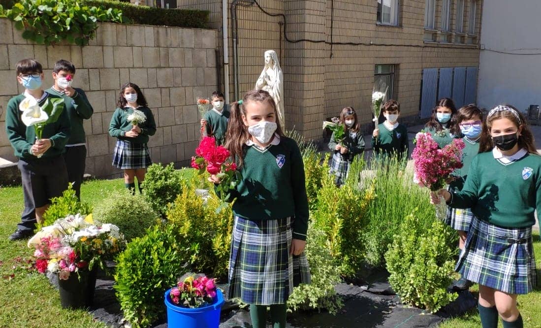 En esta ocasión, a consecuencia del protocolo COVID lo hemos hecho en el exterior, orando, cantando y depositando las flores a la imagen de la Virgen que tenemos en el jardín de la entrada al colegio.