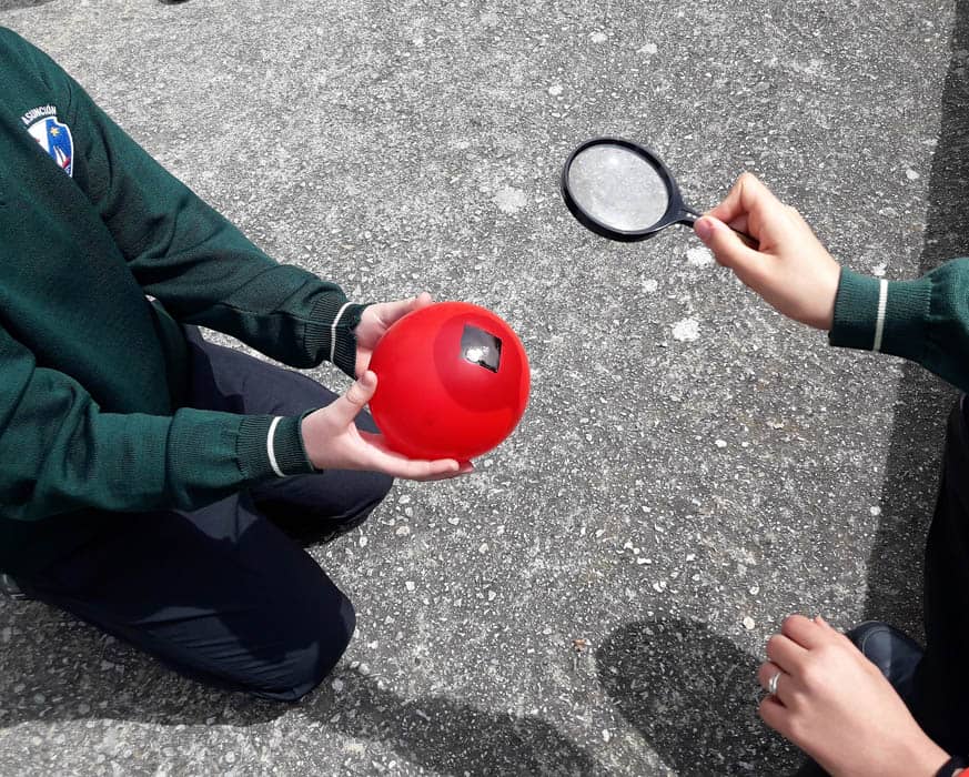 Y en el taller de la energía... A pesar de nuestros problemas con el sol.... que se escondía una y otra vez detrás de unas oscuras nubes, al final hemos podido divertirnos explotando globos de muchos colores. El color blanco no solo refleja todos los colores... también refleja el calor... y por mucho que insistíamos con la lupa, siempre era el último en explotar. El globo no era capaz de absorber energía.