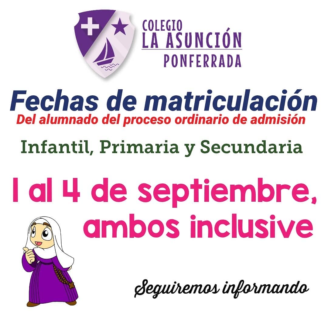 Según la Resolución de 20 de julio de 2020, de la Dirección General de Centros, Planificación y Ordenación Educativa, por la que se determinan las fechas de matriculación derivadas del proceso de admisión para el curso 2020/2021 en las etapas de educación infantil, educación primaria y educación secundaria obligatoria, la formalización de la plaza escolar adjudicada en el proceso ordinario de admisión, se llevará a cabo mediante la matrícula, que deberá realizarse entre los días 1 y 4 de septiembre de 2020, ambos incluidos.