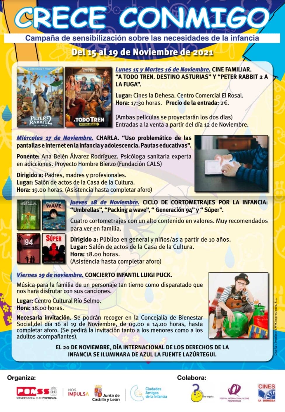 La concejalía de Acción Social del Ayuntamiento de Ponferrada, organiza un año más La Campaña de Sensibilización "Crece Conmigo", cuya finalidad es poner de manifiesto que existen una serie de necesidades en la Infancia, cuya satisfacción puede considerarse imprescindible de cara al desarrollo de las capacidades físicas, afectivas, intelectuales y sociales de nuestros menores.