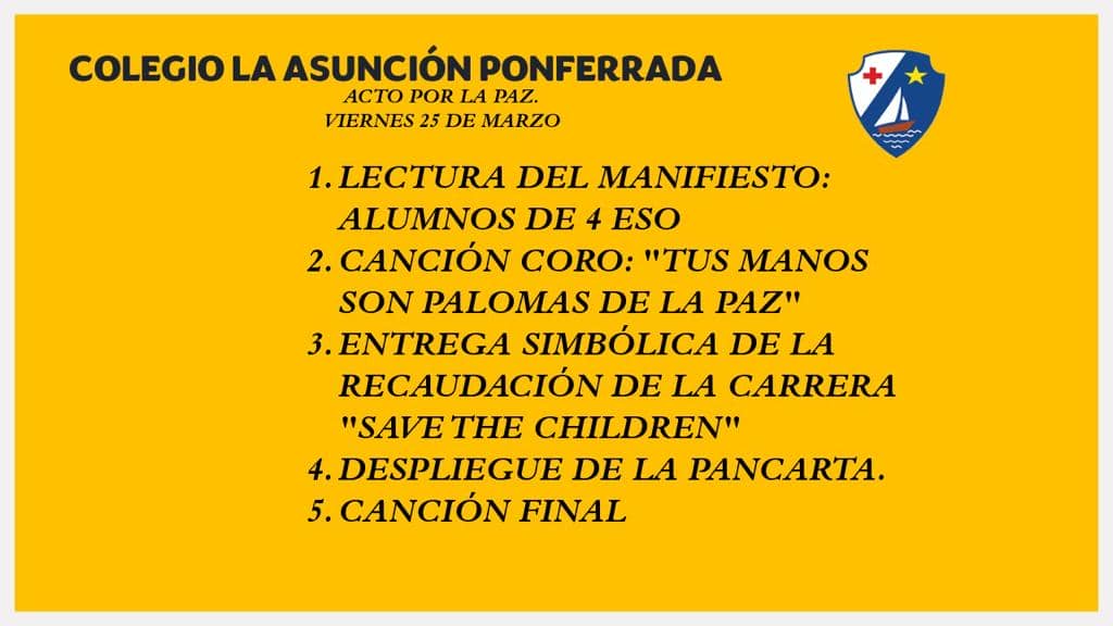 Por otro lado, este viernes tendremos a las 12:30 un Acto solidario por la Paz en el mundo, "Educando para la Paz", en el que participará una representación de alumnos de todas las etapas. Os dejamos con la planificación del evento: