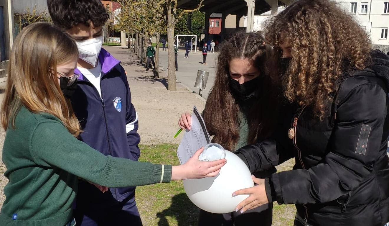 Han bajado al patio con instrumentos mágicos como son una lupa y varios globos de distintos colores y han estado experimentando cómo afecta la luz del sol a los distintos globos, llegando a la conclusión que los globos explotan porque la goma de la que están hechos se calienta con la energía que absorbe de la luz. Cuando se calienta, se estira, y eso hace que se rompa el globo.