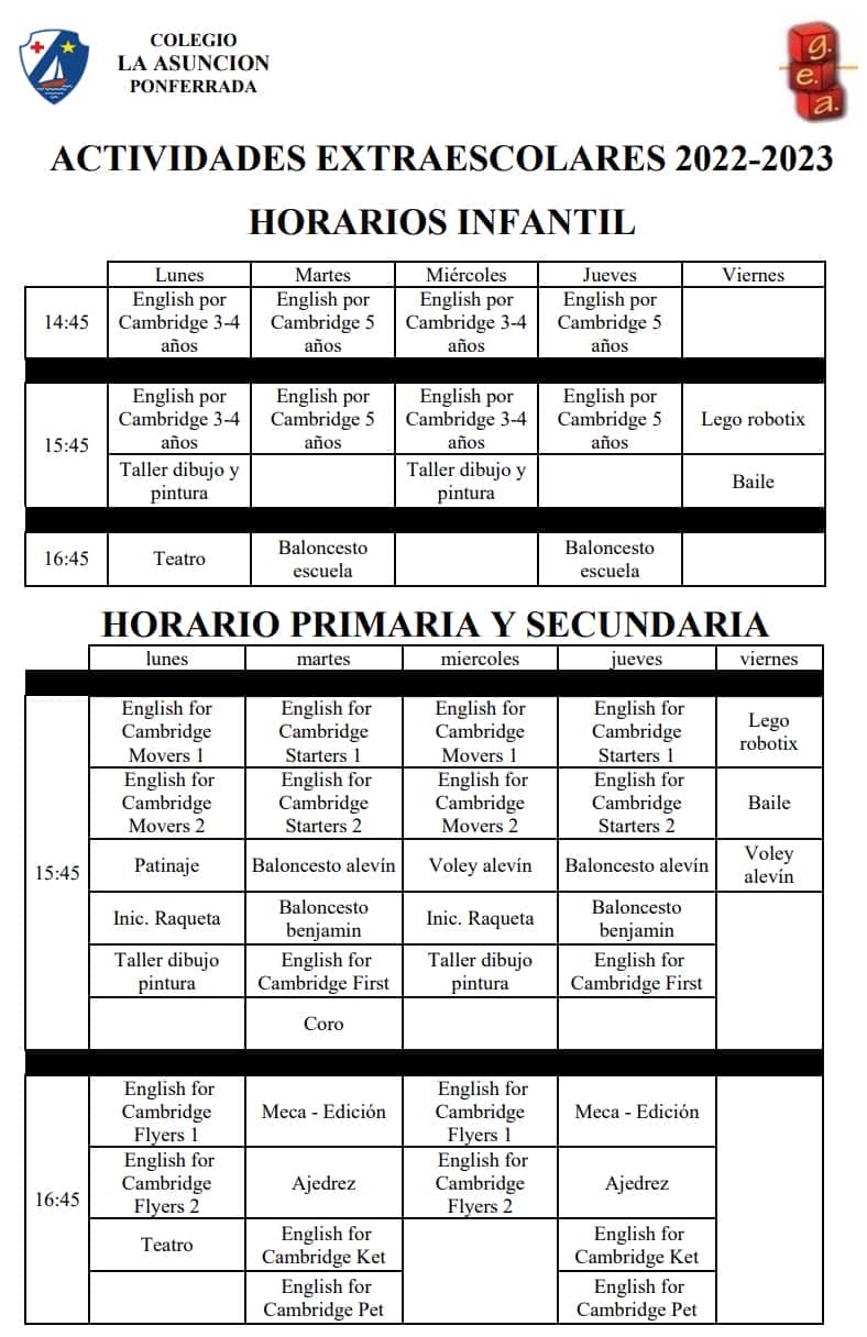 Con el fin de que las familias podáis organizar las actividades del curso futuro con el mayor tiempo posible, aquí os presentamos el calendario provisional para las extraescolares del año que viene en el que, con el fin de dar servicio al mayor número de familias, hemos ampliado el horario de las mismas y las actividades a ofertar.