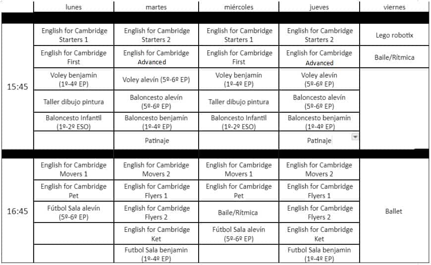 HORARIOS PROVISIONALES DE LAS ACTIVIDADES EXTRAESCOLARES EN PRIMARIA Y SECUNDARIA PARA EL CURSO 2024/25: