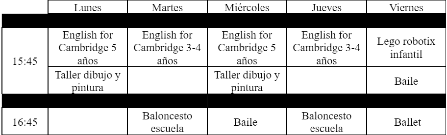 HORARIOS PROVISIONALES DE LAS ACTIVIDADES EXTRAESCOLARES EN EDUCACIÓN INFANTIL PARA EL CURSO 2024/25: